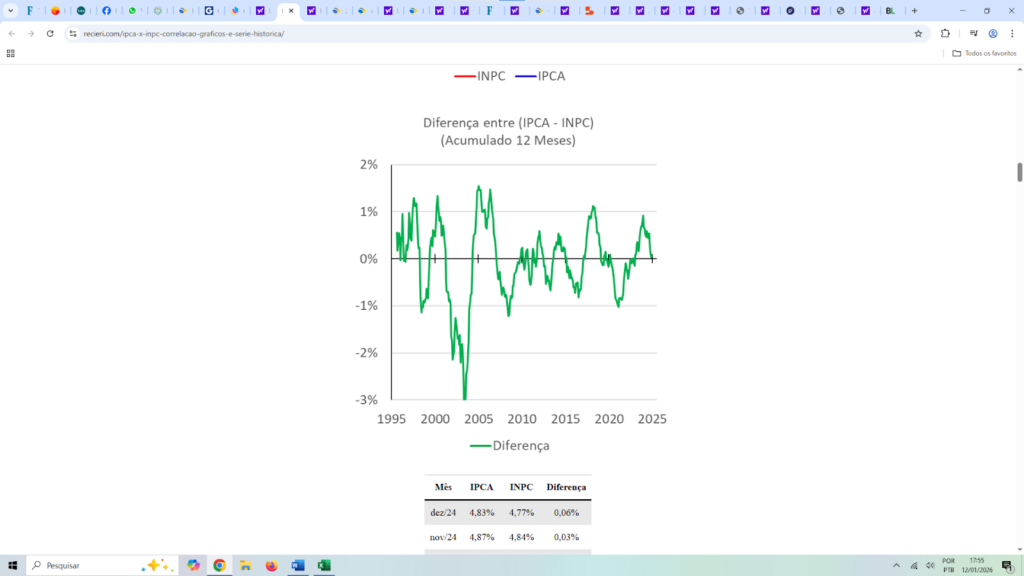 Diferença entre IPCA e INPC – acumulado em 12 meses